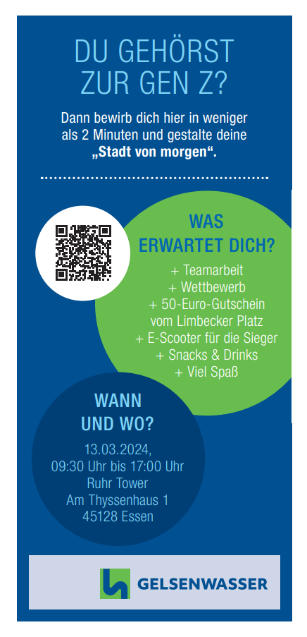 Alle weiteren Informationen, wie etwa der Ablauf am Event-Tag und das Anmeldeformular, lassen sich unter folgendem Link schnell und einfach nachlesen (https://www.gelsenwasser.de/b2b-loesungen/stadt-von-morgen) sowie aus dem FLYER entnehmen.