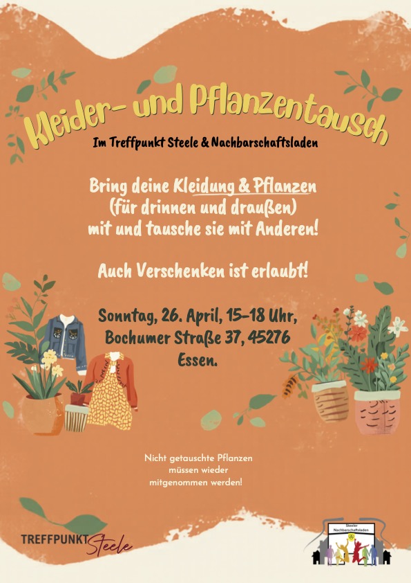 Kleider- und Pflanzentausch im Treffpunkt Steele/Steeler Nachbarschaftsladen, Bochumer Str. 37 statt. Fühlt euch alle herzlich eingeladen.